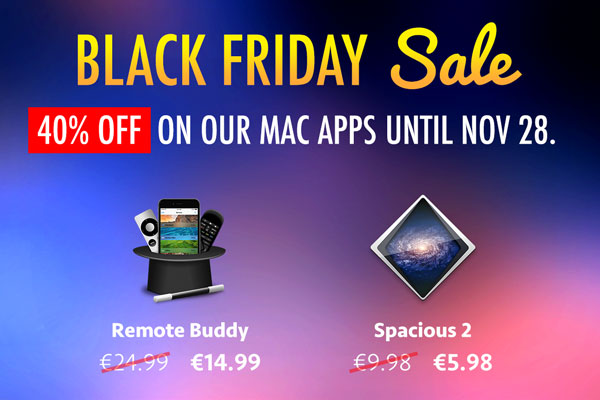 Black Friday Sale: 40% off Remote Buddy and Spacious! by Felix Schwarz / Nov 23, 2017 / in Promotions Get 40% off on Remote Buddy and Spacious from November 23 until November 28, 2017! Our Store