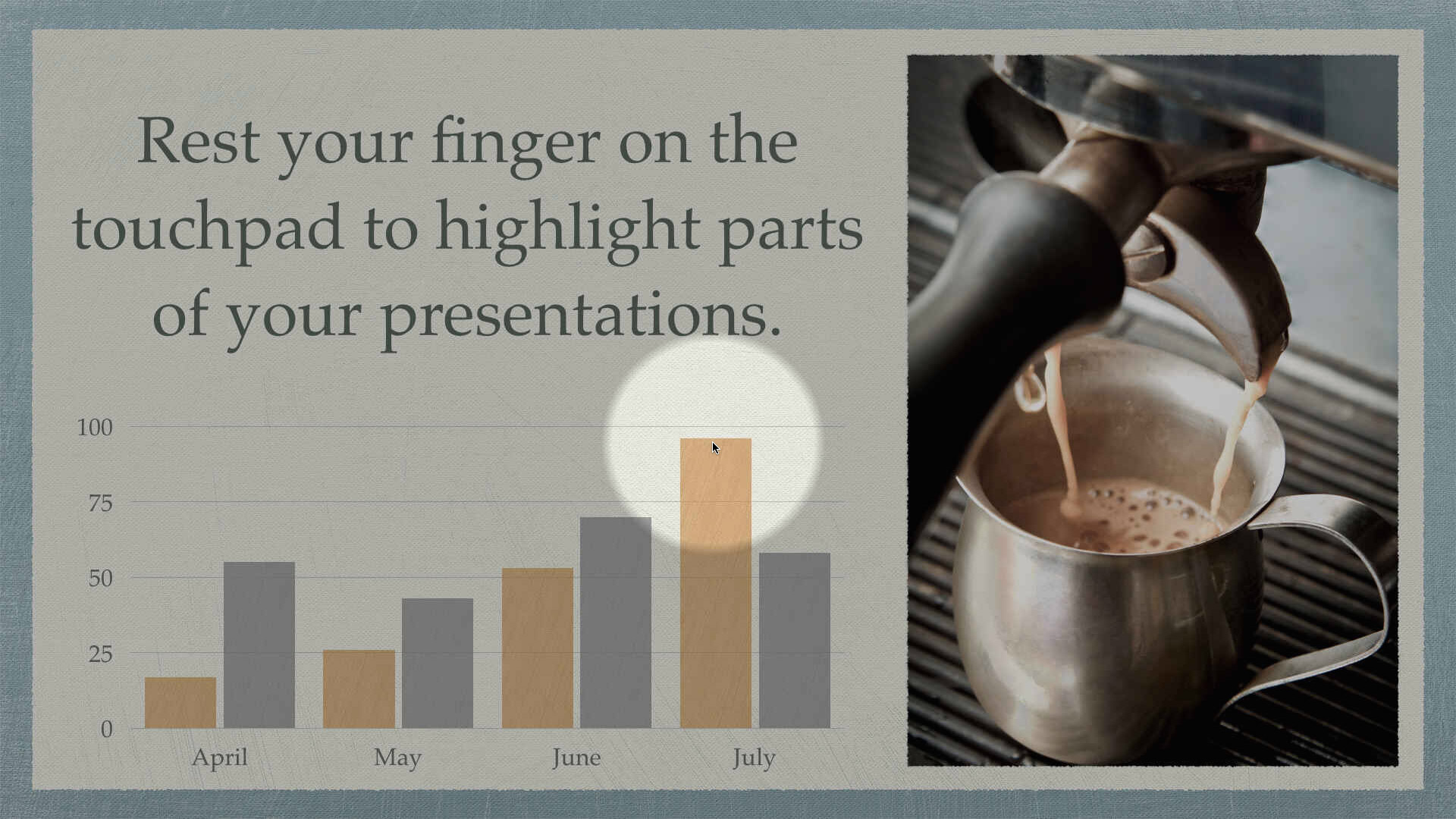 While in trackpad mode, rest a finger on the remote's touchpad for two seconds to highlight the area around the mouse cursor. When you're done, just lift the finger for two seconds and the highlight effect disappears. A terrific tool to bring more life and expression to presentations - or just locate the mouse cursor on screen.